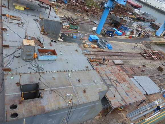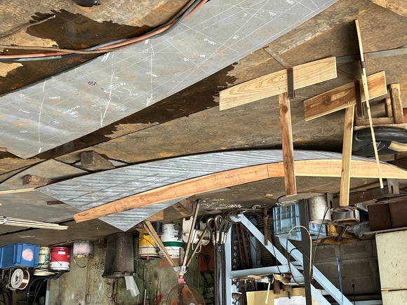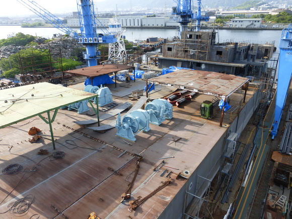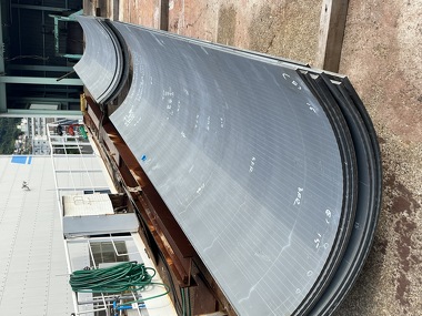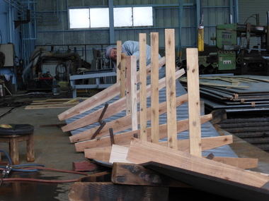 【暁鉄(ぎょう鉄)】 船首・船尾などの曲面の外板は、平らな鋼材を焼いてさまざまな曲がり形状にします。