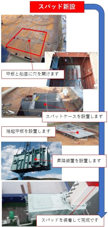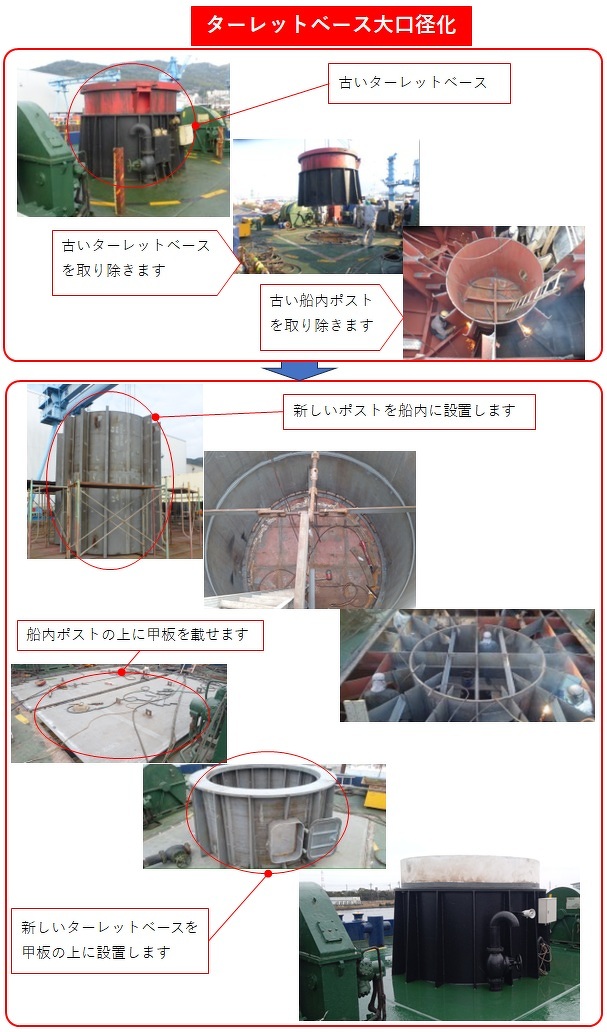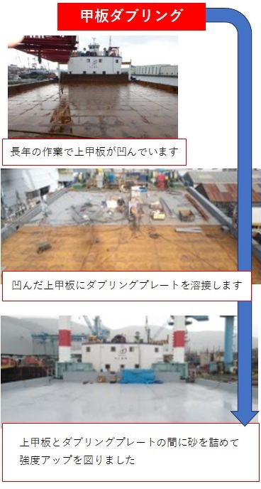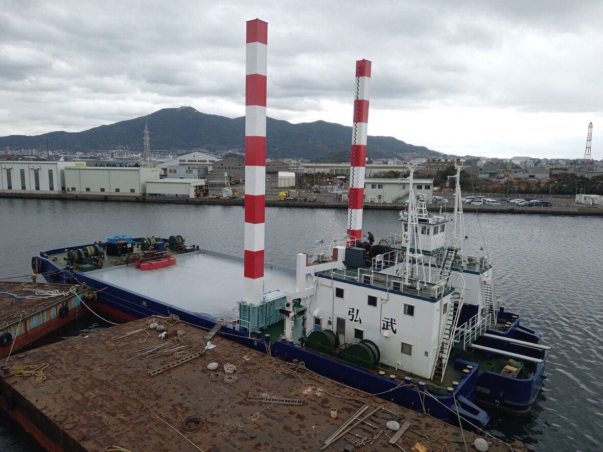 2025年03月06日(木) お知らせ ミツミ殿向けクレーン台船の改造を行いました 株式会社ミツミ殿が保有されているクレーン船「弘武」の主な改造内容です 大型クレーン載せ替えの為の改造、スパッドの新設、上甲板の強化を行いました 作業性向上の為にスパッドを新設しました 作業甲板を強化する為、上甲板にダブリングを施工しました 大型のクレーンを搭載する為に大口径のターレットベースに変更しました