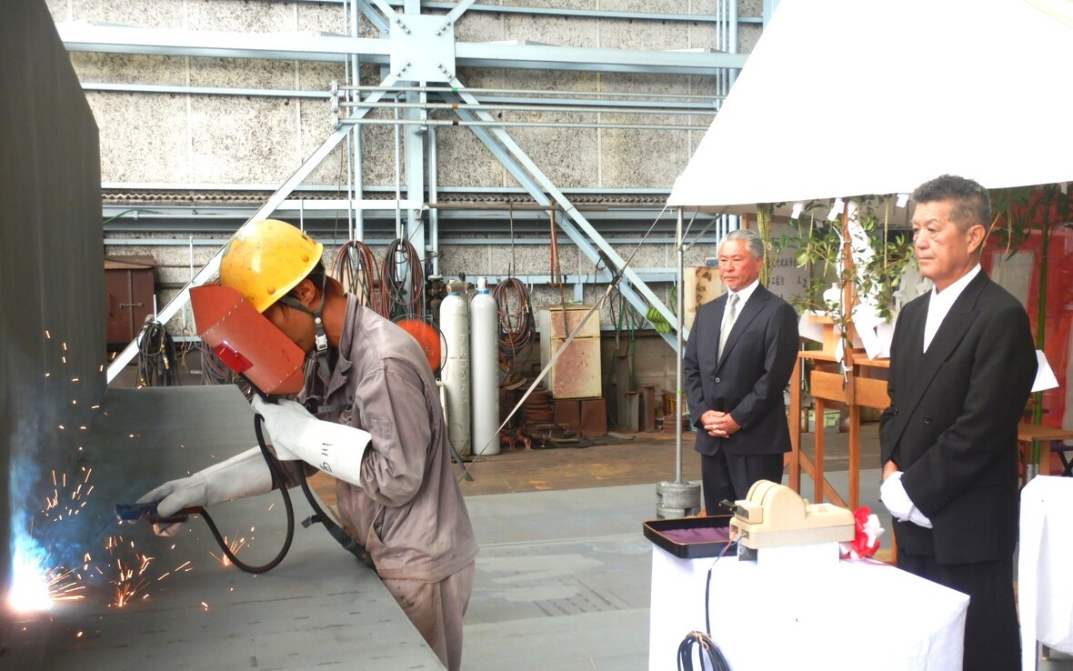 2025年07月23日(水) お知らせ 三和プロフィット殿向け350KL積給油船(SNo.555)の起工式を執り行いました。 令和7年7月18日(金)に「三和プロフィット殿向け350KL積給油船(SNo.555)」の起工式が執り行われ、工事の安全を祈願しました。 第十六藤洋丸に続き、2隻目の御発注をいただきました。令和7年12月末の引き渡しに向け、船主様に満足していただけるよう、精いっぱい頑張ります!