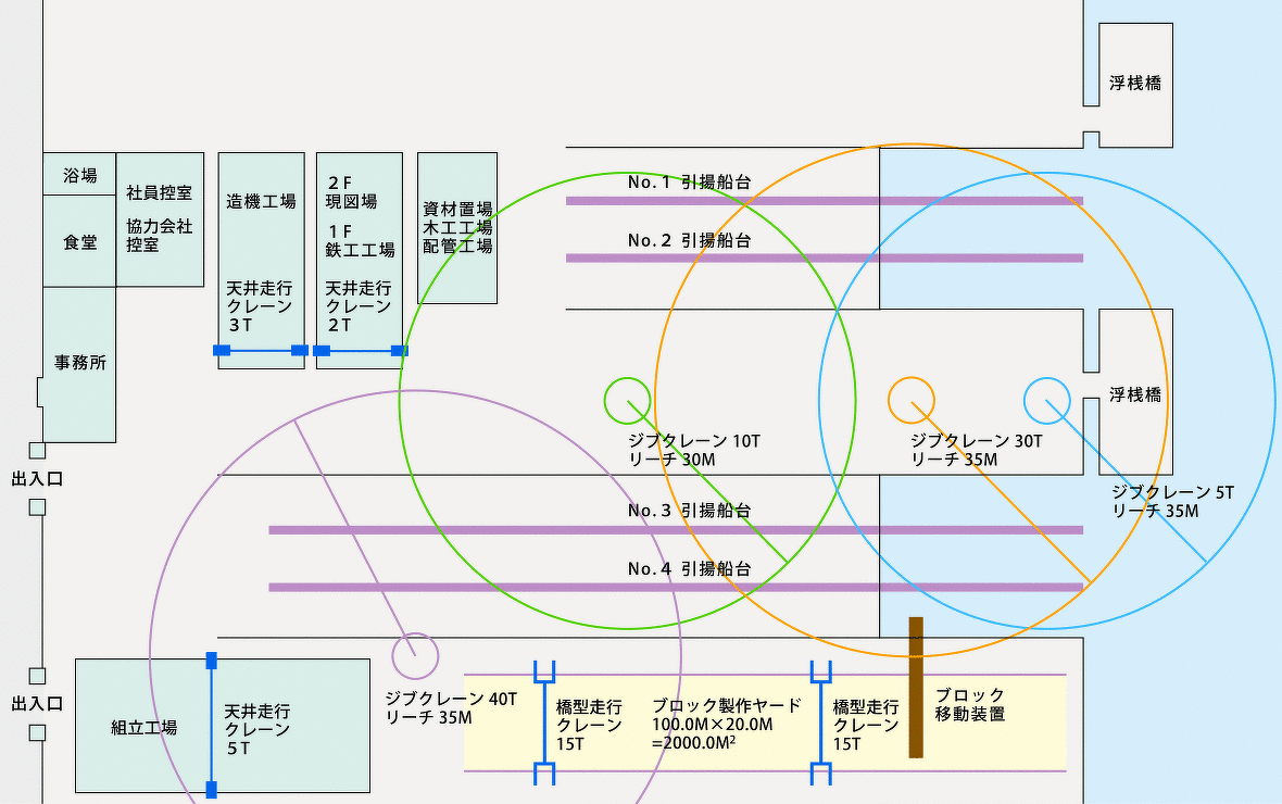 東洋造船鉄工は、16,700㎡の敷地の中に、効率良く船が建造出来るように設備がレイアウトされています。