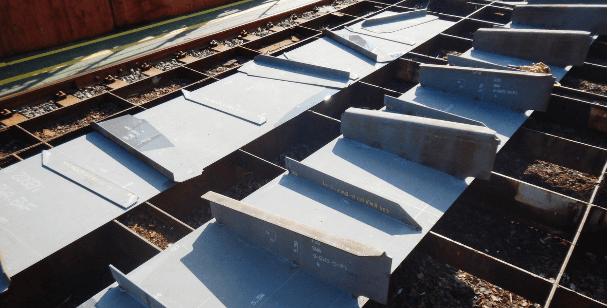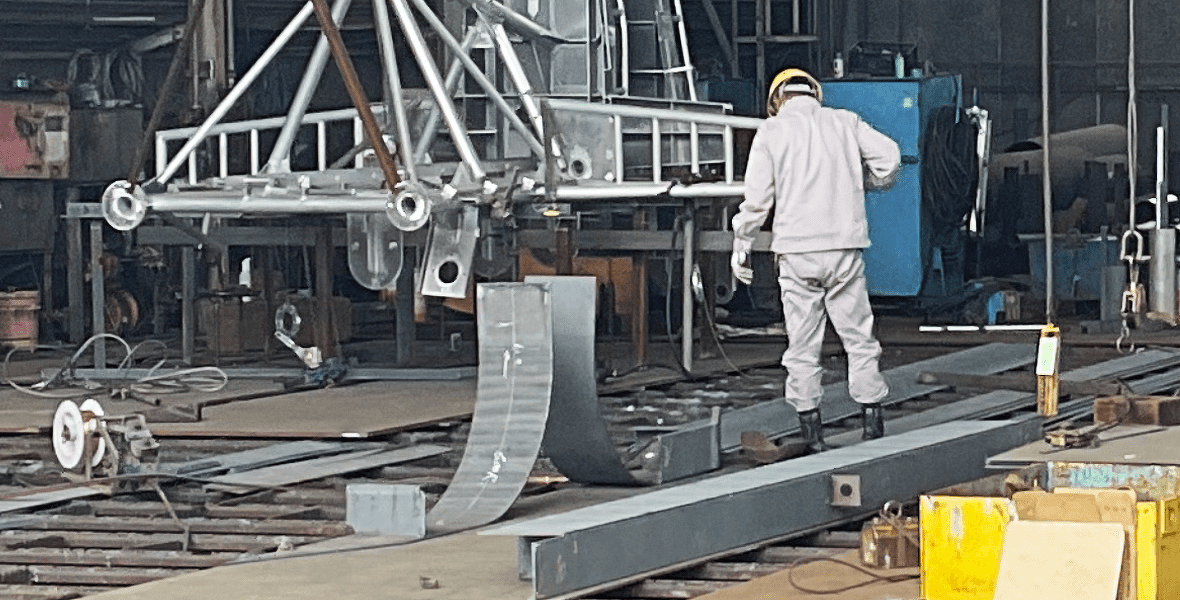 切り分けた部材を小分けにして組んでいきます。水圧に負けない強度が必要な為、鉄板を底板、側面板、天井板などにわけてブラケットやアングル、ガーダーと言われる補強を入れていきます。効率的にブロック建造作業や溶接を行うために、この小組の作業で部分ごとに組んでいきます。