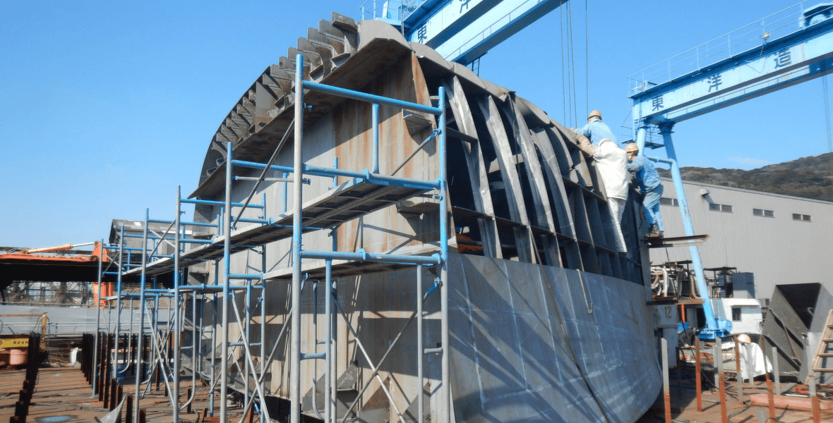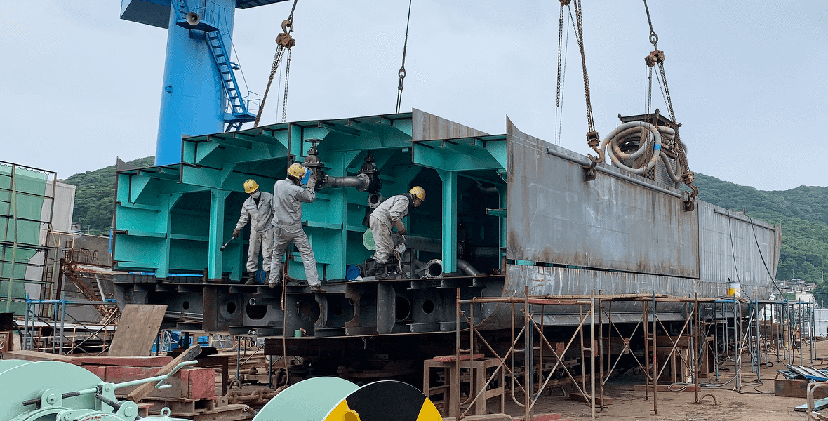 東洋造船鉄工ではブロック建造方式によって新造船を建造しております。ブロック建造方式とは、船を分割していくつかのブロックとして分けて組み立てていき、最後にそれを繋げて船の形とする建造方式です。